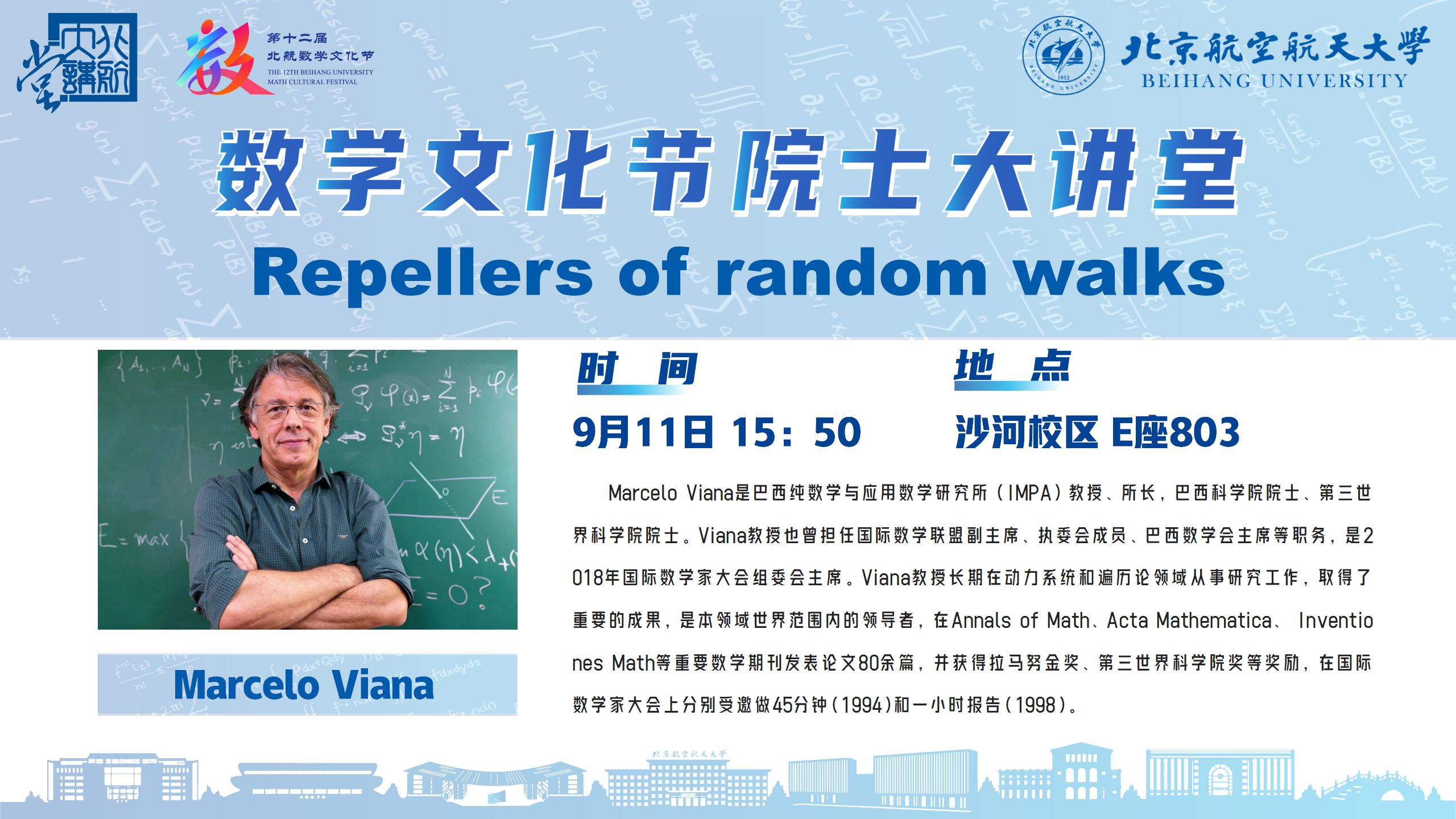 Marcelo Viana是巴西纯数学与应用数学研究所(IMPA)教授、所长,巴西科学院院士、第三世界科学院院士。Viana教授也曾担任国际数学联盟副主席、执委会成员、巴西数学会主席等职务,是2018年国际数学家大会组委会主席。Viana教授长期在动力系统和遍历论领域从事研究工作,取得了重要的成果,是本领域世界范围内的领导者,在Annals of Math、Acta Mathematica、 Inventiones Math等重要数学期刊发表论文80余篇,并获得拉马努金奖、第三世界科学院奖等奖励,在国际数学家大会上分别受邀做45分钟(1994)和一小时报告(1998)。